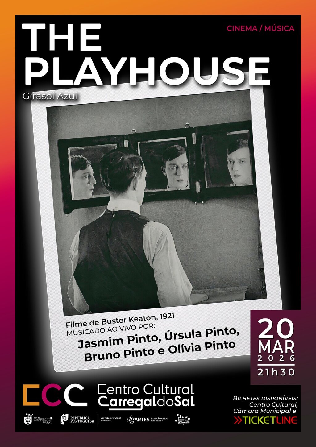 A jovem trompetista Jasmim Pinto estreia-se na área da composição com a criação de uma banda sonora inédita para o famoso filme ‘The Playhouse’ de Buster Keaton. Juntam-se na interpretação ao vivo Úrsula Pinto (violoncelo), Bruno Pinto (guitarra) e Olívia Pinto (baixo) para oferecerem uma nova leitura deste clássico onde Keaton joga com a relação